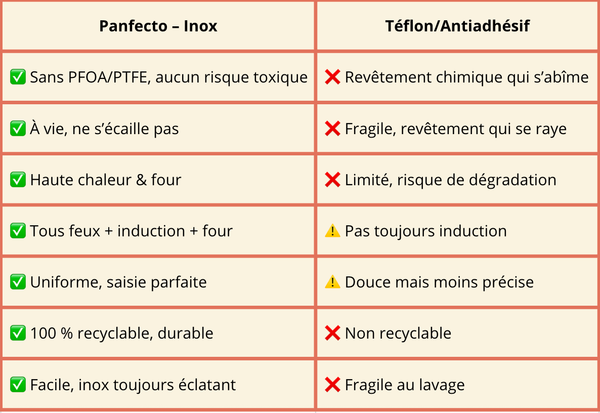 Avec Panfecto, chaque casserole et chaque poêle est conçue en inox pur, sans aucun revêtement chimique.